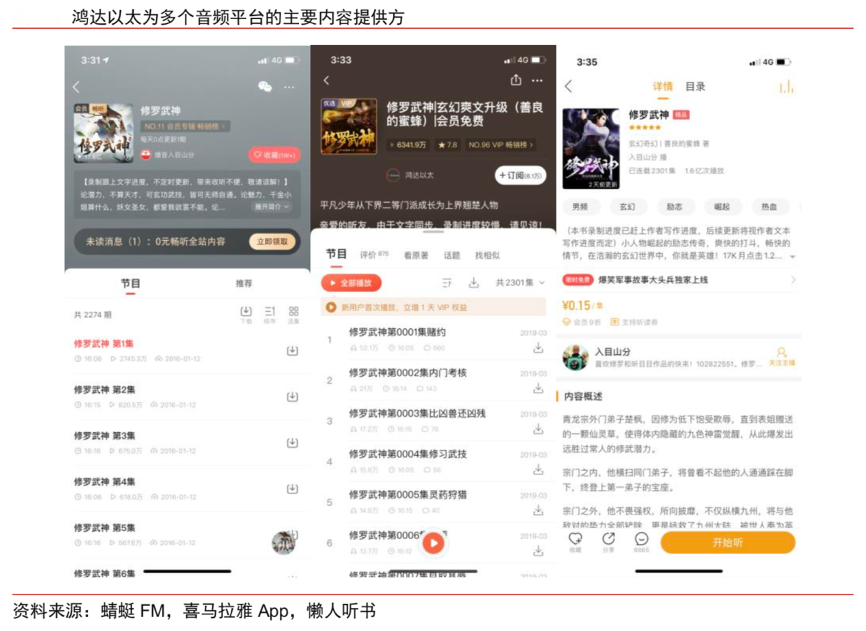 經(jīng)典案例:根據(jù)蜻蜓FM、喜馬拉雅App、懶人聽書、中信證券研究部等綜合資訊表明,鴻達(dá)以太憑借海量的獨(dú)家有聲內(nèi)容形成護(hù)城河,成為喜馬拉雅、蜻蜓 FM、懶人聽書、酷我暢聽等音頻平臺的主要內(nèi)容提供方之一。鴻達(dá)以太旗下作品《修羅武神》、《權(quán)利巔峰》在蜻蜓 FM、喜 馬拉雅、懶人聽書、酷我暢聽的總播放量均超過25 億次。