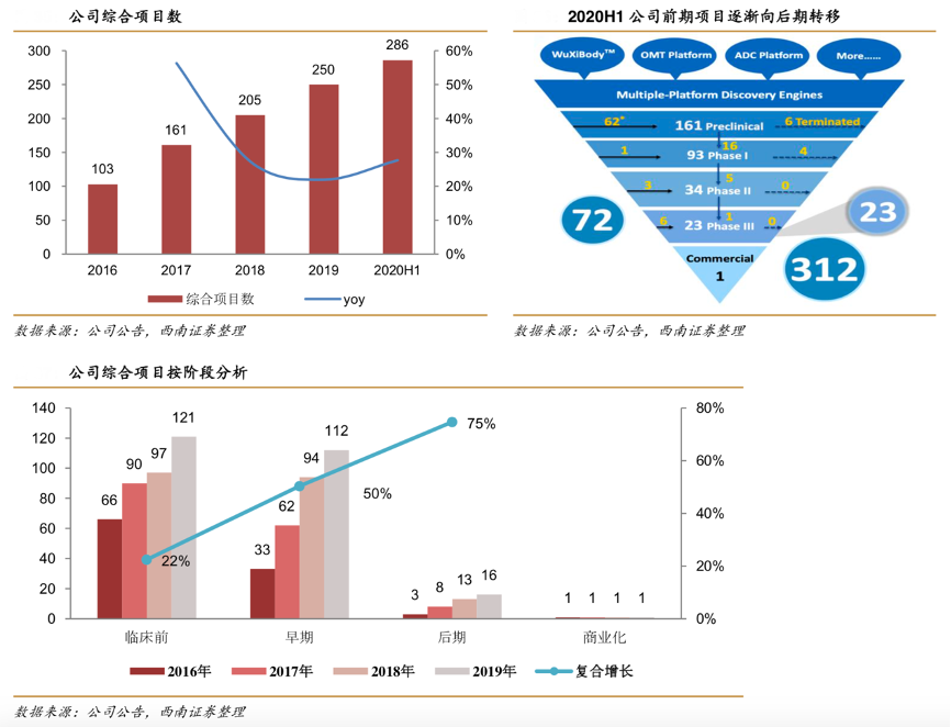 經(jīng)典案例:根據(jù)公司公告、西南證券等綜合資訊表明,藥明生物始終堅持“Follow-the-Molecule”的戰(zhàn)略模式,即“跟著藥物分子發(fā)展階段擴(kuò)大業(yè)務(wù)”。生物藥研發(fā)項目粘性較強(qiáng),鎖定早期項目更容易使合作關(guān)系延續(xù)至商業(yè)化生產(chǎn)階 段??蛻羧糇兏?wù)商會花費(fèi)較高的轉(zhuǎn)讓成本,因此更多客戶傾向選擇全套的研究和生產(chǎn)外包服務(wù)。在公司戰(zhàn)略模式指導(dǎo)下,藥明生物的客戶基礎(chǔ)不斷加大,綜合項目數(shù)由 2019 年同期的 224 個,增長 27.7%至 2020 年上 半的 286 個。