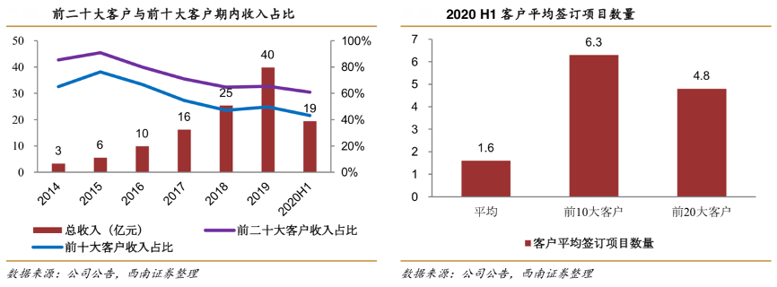 經(jīng)典案例:根據(jù)公司公告、西南證券等綜合資訊表明,近年來,藥明生物公司臨床后期研發(fā)的能力不斷加強(qiáng),越來越多的公司選擇一貫制服務(wù),即從藥物發(fā)現(xiàn)到臨床試驗都由藥明生物來完成,從其大客戶的情況來看,2020 年上半年公司前十大客戶的收入占比為 43.1%,其十大客戶的平均簽訂的項目數(shù)量為6個,新項目續(xù)簽率超過80%。