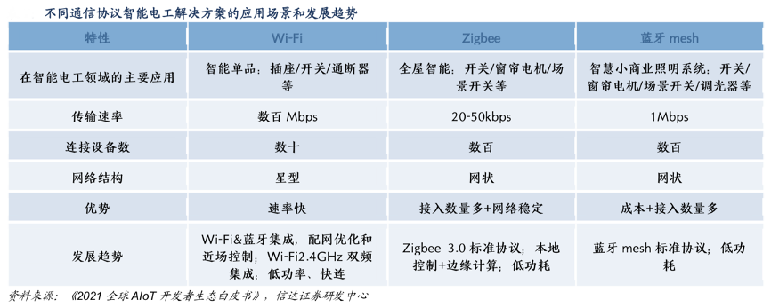 典型現(xiàn)象:根據(jù)《2021全球AIoT開發(fā)者生態(tài)白皮書》、信達(dá)證券研發(fā)中心等綜合資訊表明,從需求側(cè)來看,電工產(chǎn)品作為人們生活和工作空間中 的基礎(chǔ)設(shè)施,有著極大的智能化發(fā)展空間。隨著 AIoT 技術(shù)的發(fā)展,Wi-Fi、Zigbee、藍(lán)牙 mesh、Sub-G 以及 NB- IoT 等多種通信連接協(xié)議為空間智能交互愿景的實現(xiàn)添磚加瓦。