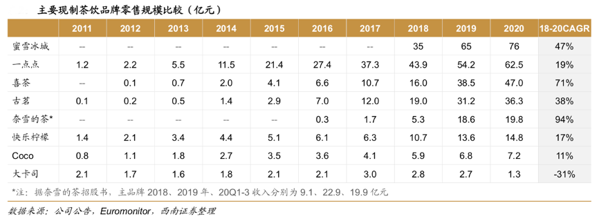 經(jīng)典案例:根據(jù)公司公告、Euromonitor、西南證券等綜合資訊表明,現(xiàn)制茶飲行業(yè)中,連鎖加盟品牌占據(jù)行業(yè)龍頭地位,新興自營品牌經(jīng)營規(guī)模高速擴張?,F(xiàn)制茶飲市場兩大龍頭蜜雪冰城、一點點在加盟模式下 2018-2020 年仍能維持較穩(wěn)健的增長水平。喜茶、奈雪的茶 2018-2020 年銷售增速與渠道擴張速度基本相同,加速拓店帶動經(jīng)營規(guī)模快速增長。