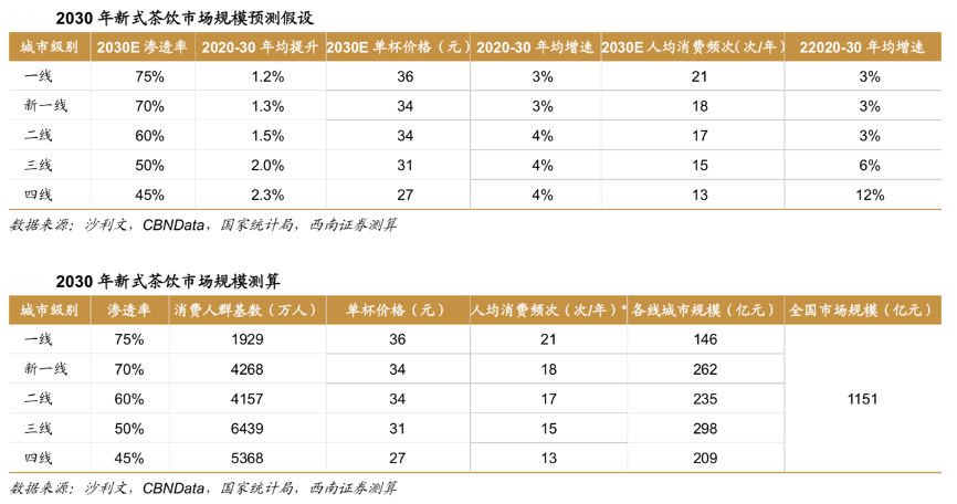 同時根據(jù)沙利文、CBNData、國家統(tǒng)計局、西南證券等綜合資訊表明,預計 2030 年 1-4 線城市規(guī)模分別為146、262、235、 298、209 億元,全國新式茶飲市場空間為 1151 億元。