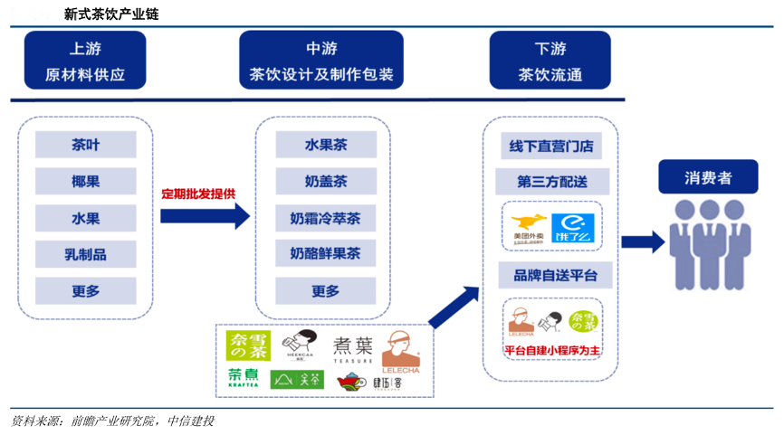 經(jīng)典案例:根據(jù)前瞻產(chǎn)業(yè)研究院、中信建投等綜合資訊表明,新式茶飲的品質(zhì)主要取決于茶基底,因此制作茶基底的茶葉是新式茶飲的核心。新式茶飲行業(yè)產(chǎn)業(yè)鏈上游主要是原材料供應環(huán)節(jié),這一環(huán)節(jié)提供制作茶飲需要的農(nóng)副產(chǎn)品,包括茶葉、水果、乳制品等。