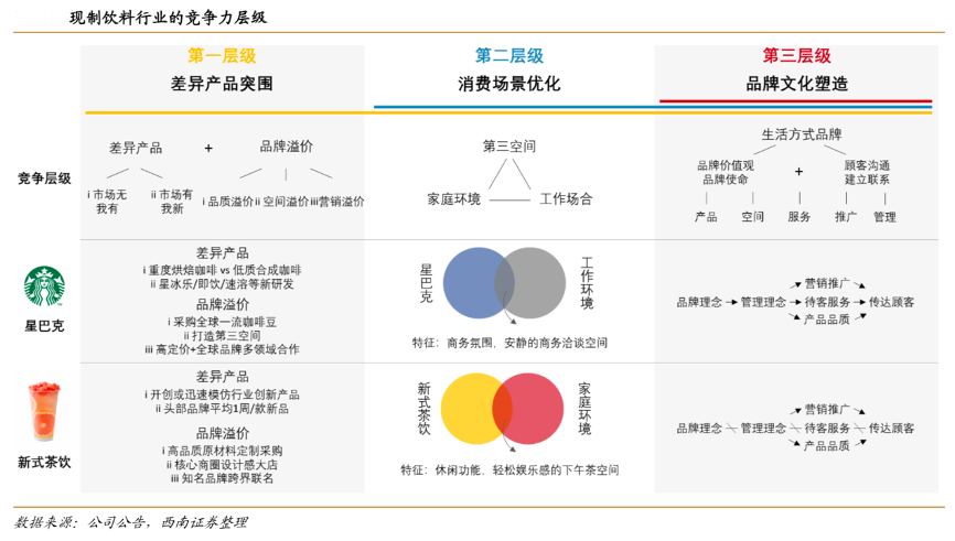 經(jīng)典案例:根據(jù)公司公告、西南證券等綜合資訊表明,現(xiàn)制飲料品牌競爭力的可劃分為三個層級:第一層級靠差異化產(chǎn)品突圍,第二層級靠消費場景與消費者建立聯(lián)系,第三層級靠傳播品牌理念,培養(yǎng)品牌“調(diào)性”或“氣質(zhì)”,融入消費者的日常生活成為生活方式品牌。