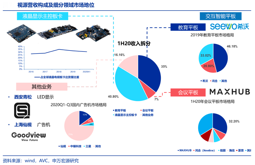 經(jīng)典案例:根據(jù)wind、AVC、申萬宏源研究等綜合資訊表明,視源股份公司 以液晶顯示板卡起家,連續(xù)多年銷量份額全球第一;其不斷研發(fā)布局新產(chǎn)品,后準(zhǔn)確把握住了國內(nèi)教育信息化 1.0 的行業(yè)紅利,通過“希沃”交互智能平板搶占市場并迅速發(fā)展成國內(nèi)市占率第一的品牌,并通過 MAXHUB 會議平板布局國內(nèi)會議信息化場景,國內(nèi)市占率排行第一。