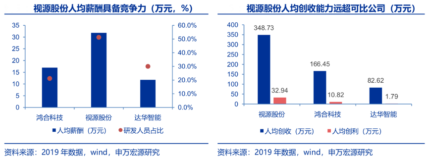 經(jīng)典案例:根據(jù)2019年數(shù)據(jù)、wind、申萬宏源研究等綜合資訊表明,視源股份通過股權(quán)激勵和較高的薪酬收攏優(yōu)秀研發(fā)技術(shù)人才,2019 年公司人均薪酬 32.82 萬元,和可比公司相比具備競爭力。2019 年公司研發(fā)人員占比51.27%,具備本科以上學(xué)歷的員工占比約 82.62%。2019年其人均創(chuàng)收 348.73 萬元,人均創(chuàng)利 32.94 萬元,高研發(fā)開支和高學(xué)歷研發(fā)人員帶動公司人均創(chuàng)收能力遠(yuǎn)超可比公司。