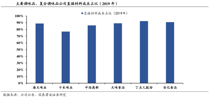 經典案例:根據公司公告、國泰君安證券研究等綜合資訊表明,調味品公司生產過程中所需要的直接材料成本占生產成本比重的80%-95%左右,其中復合調味品企業(yè)直接材料成本占比相較于傳統調味品企業(yè)更高一籌,因此復合調味料的盈利能力對直接材料價格變動極為敏感。根據天味食品 2018 年數據,天味食品的利潤總額對于直接材料/ 包材價格變動的敏感系數分別達到-2.13/-0.33。