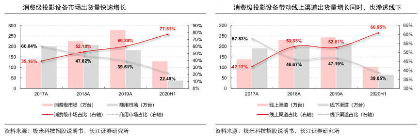 經(jīng)典案例:根據(jù)極米科技招股說明書、長江證券研究所等綜合資訊表明,在需求端消費升級、消費主力年輕化、顯示需求大屏化、家居需求智能化等趨勢下,消費級投影設備市場 2017-2019 年年均復合增速達 46.5%。隨著消費級投 影設備逐步放量,線上渠道占比也隨之提升,2017年至2019年線上投影設備出貨量年均復合速達32.0%,但線下渠道出貨量也并未下降,反映消費級投影設備正逐步向線下滲透。