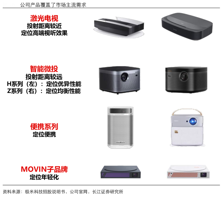經(jīng)典案例:根據(jù)極米科技招股說明書、公司官網(wǎng)、長江證券研究所等綜合資訊表明,極米公司首先以性能均衡的Z 系列打開市場,由一開始的單一系列,覆蓋較少需求,到目前的多種系列,全面覆蓋多種需求;其每年召開發(fā)布會,不斷迭代消費級投影設備,提高產(chǎn)品易用性,2020 年 7 月 27 日,極米科技推出旗下全新品牌MOVIN,同時正式發(fā)布兩款定位年輕化的娛樂輕投影新品 MOVIN01X 和 MOVIN01。