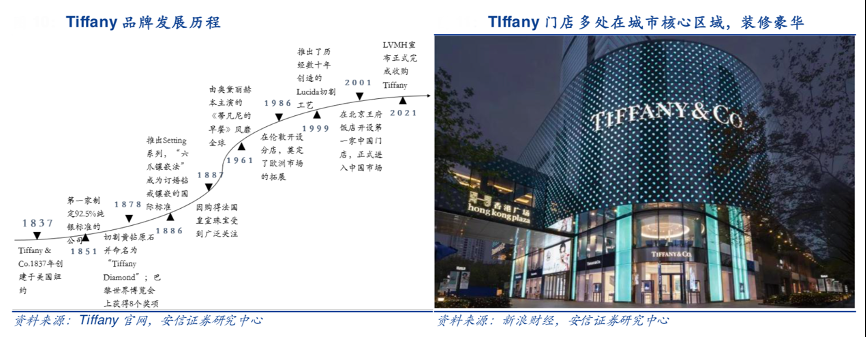 經(jīng)典案例:根據(jù)Tiffany官網(wǎng)、新浪財經(jīng)、安信證券研究中心等綜合資訊表明,以 Tiffany 為例,該品牌于 1837 年成立于美國,最初以制造銀質(zhì)餐具為主,在 1886 年推出經(jīng)典的“Setting 系列鉆戒”后,開始以訂婚鉆戒鑲嵌產(chǎn)品聞名。奢侈珠寶品牌通過持續(xù)的營銷、裝修豪華并位于城市核 心區(qū)域的門店進一步維護其高端的品牌形象。