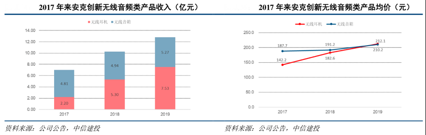 經(jīng)典案例:根據(jù)公司公告、中信建投等綜合資訊表明,安克創(chuàng)新公司無線音頻類主要是無線耳機(jī)和無線音箱。無線耳機(jī)收入由 2017 年 2.20 億元增至 2019 年 7.53 億元, CAGR 為 85%,是其增長(zhǎng)最快的細(xì)分產(chǎn)品之一;無線音箱收入由 2017 年 4.81 億元增至 2019 年 5.27 億元,主打便攜、交互體驗(yàn)與光影效果,市場(chǎng)表現(xiàn)良好。