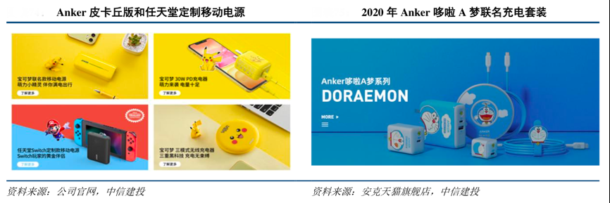經(jīng)典案例:根據(jù)公司官網(wǎng)、安克天貓旗艦店、中信建投等綜合資訊表明,安克創(chuàng)新公司通過全球知名跨界 IP 合作,樹立年輕化、時(shí)尚感品牌形象,例如Anker于 2017 年拿到精靈寶 可夢(mèng)的品牌授權(quán),推出精靈球版和皮卡丘版定制移動(dòng)電源;2018 年與任天堂聯(lián)合推出定制款移動(dòng)電源;2020年推出哆啦 A 夢(mèng)聯(lián)名充電套裝等。