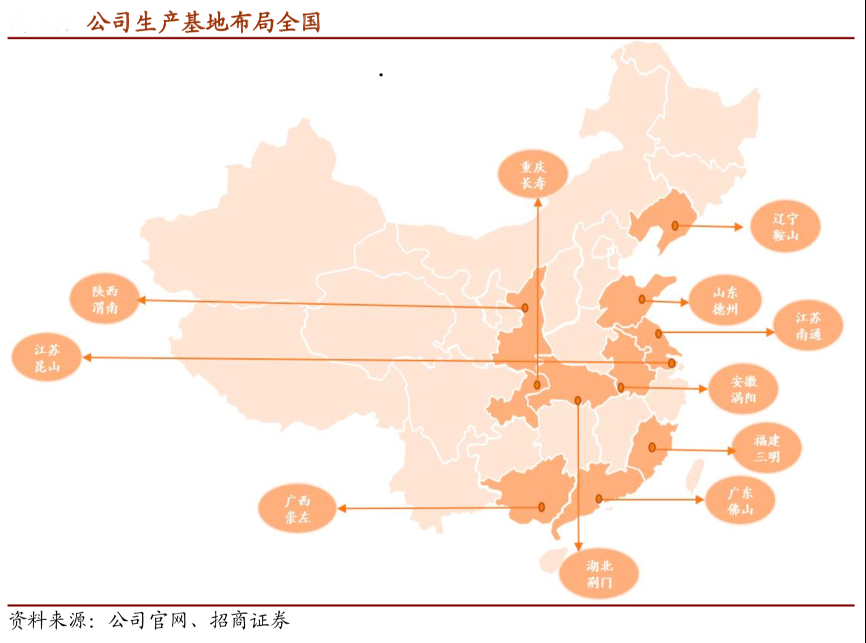 經(jīng)典案例:根據(jù)公司官網(wǎng)、招商證券等綜合資訊表明,截至 2020 年年底,科順股份公司已在全國(guó)建成 8 個(gè)生產(chǎn)基地, 共布局 11 個(gè),分別位于佛山、昆山、南通、重慶、德州、鞍山、荊門(mén)、渭南、三明(在建)、渦陽(yáng)(擬建)、崇左(籌建),產(chǎn)能覆蓋基本實(shí)現(xiàn)全國(guó)化布局,實(shí)現(xiàn)產(chǎn)品運(yùn)輸半徑 500 公里,且選址靠近下游市場(chǎng)需求+原材料供應(yīng)充足,保障了對(duì)下游需求的及時(shí)響應(yīng)。