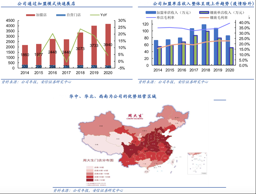 經(jīng)典案例:根據(jù)公司年報、安信證券研究中心等綜合資訊表明,周大生公司截至 2020 年底,門店數(shù)量已經(jīng)達到4189 家,其中 3940 家為加盟店, 門店數(shù)量位居國內(nèi)珠寶品牌第一,且在全國多個省市實現(xiàn)了密集化布局。2019年其加盟商的單店收入達到 108 萬元,其中鑲嵌收入為 79 萬元,5 年 CAGR 分別為 8.4%/7.8%,單店毛利率/單店鑲嵌毛利率也保持相對穩(wěn)定,體現(xiàn)了公司高質(zhì)量的渠道建設(shè)能力。