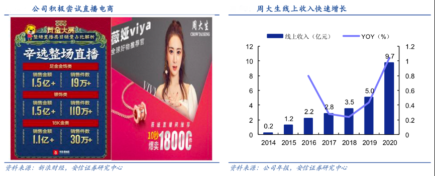 經(jīng)典案例:根據(jù)公司年報、新浪財經(jīng)、安信證券研究中心等綜合資訊表明,2014年周大生便成立電商團隊,目前線上運營團隊達到 150 人,2020 年實現(xiàn)銷售收入 9.7 億元(+94%),占總收入比重接 近 20%。公司持續(xù)發(fā)力線上業(yè)務(wù),推進多平臺合作,2020年其天貓旗艦店/集市店/飾品旗艦店/ 抖音店分別貢獻線上收入比重為53.83%/20.01%/6.78%/14.33%,其他由快手、蘇寧等貢獻。