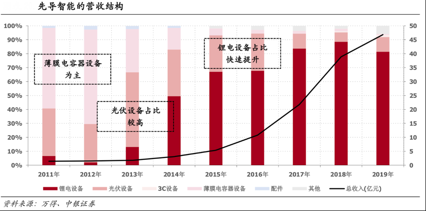 經(jīng)典案例:根據(jù)萬得、中銀證券等綜合資訊表明,2013年以前,薄膜電容器設(shè) 備貢獻(xiàn)了先導(dǎo)智能公司大部分的收入。在切入光伏和鋰電池領(lǐng)域后,2013年前后光伏行業(yè)的高景氣度拉動其光伏設(shè)備收入快速提升。先導(dǎo)智能公司的卷繞機(jī)技術(shù)成功遷移到鋰電池設(shè)備領(lǐng)域,而伴隨著新能源汽車普及程度的提高,鋰電設(shè)備收入迅速提升,拉動其業(yè)績快速增長。