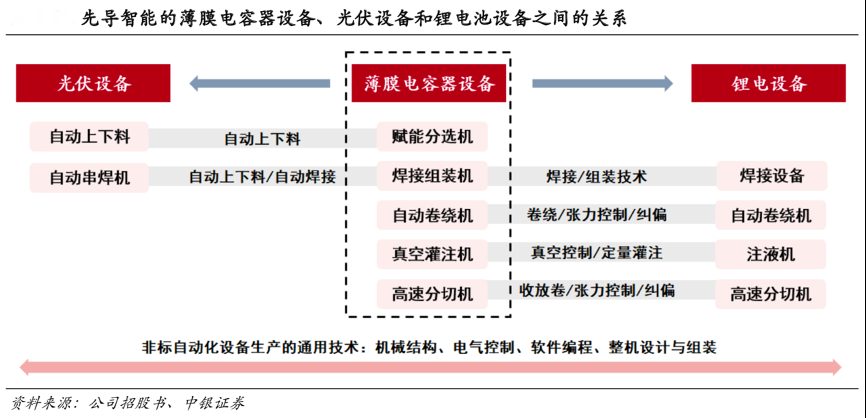 經(jīng)典案例:根據(jù)公司招股書、中銀證券等綜合資訊表明,先導(dǎo)智能卡位技術(shù)含量高、工藝地位關(guān)鍵的全自動卷繞機(jī),開發(fā)薄膜電容器制造的成套自動化設(shè)備。在薄膜電容器設(shè)備的生產(chǎn)與研發(fā)中,其一方面積累了機(jī)械結(jié)構(gòu)、電氣控 制、軟件編程和整機(jī)設(shè)計與組裝等非標(biāo)自動化設(shè)備生產(chǎn)的通用技術(shù),另一方面掌握了自動卷繞、高速分切技、噴金、賦能分選等與電容器制造相關(guān)的核心技術(shù)。憑借“通用”+“專用”的技術(shù)銜接,先導(dǎo)智能成功進(jìn)入下游景氣旺盛的鋰電池設(shè)備和光伏設(shè)備領(lǐng)域。