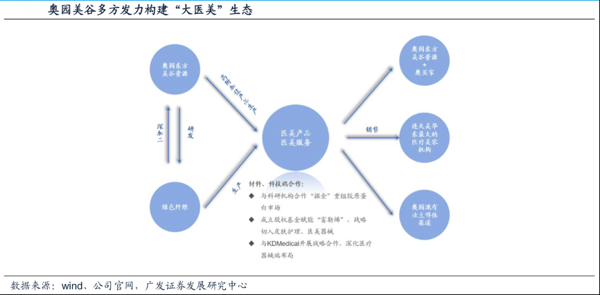 經(jīng)典案例:根據(jù)wind、公司官網(wǎng)、廣發(fā)證券發(fā)展研究中心等綜合資訊表明,自發(fā)布公司新戰(zhàn)略以來(lái),奧園美谷動(dòng)作不斷,目前已初步完成醫(yī)美上中下游“大 醫(yī)美”生態(tài)架構(gòu)。1)通過(guò)收并購(gòu)獲取中游醫(yī)美服務(wù)機(jī)構(gòu)現(xiàn)有資源,完善醫(yī)美服務(wù)機(jī) 構(gòu)的初步布局;2)持續(xù)推進(jìn)公司綠纖板塊落地,與科研機(jī)構(gòu)、優(yōu)勢(shì)終端護(hù)膚品牌、 優(yōu)質(zhì)醫(yī)療器械公司深度合作,迅速切入醫(yī)美材料、器械及科技領(lǐng)域;3)渠道端依托控股公司中國(guó)奧園集團(tuán)優(yōu)勢(shì),充分利用和結(jié)合其在上海奧園美谷的戰(zhàn)略布局、廣闊的銷售平臺(tái)資源及潛在的客戶資源。