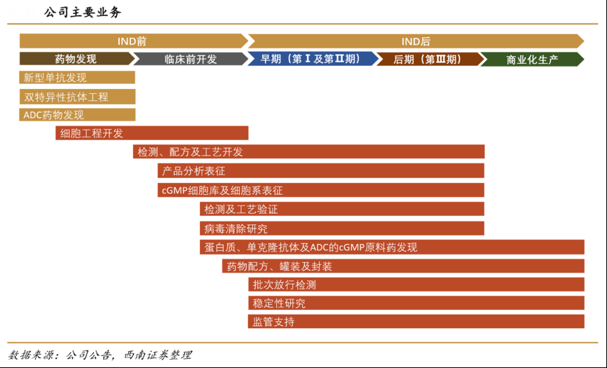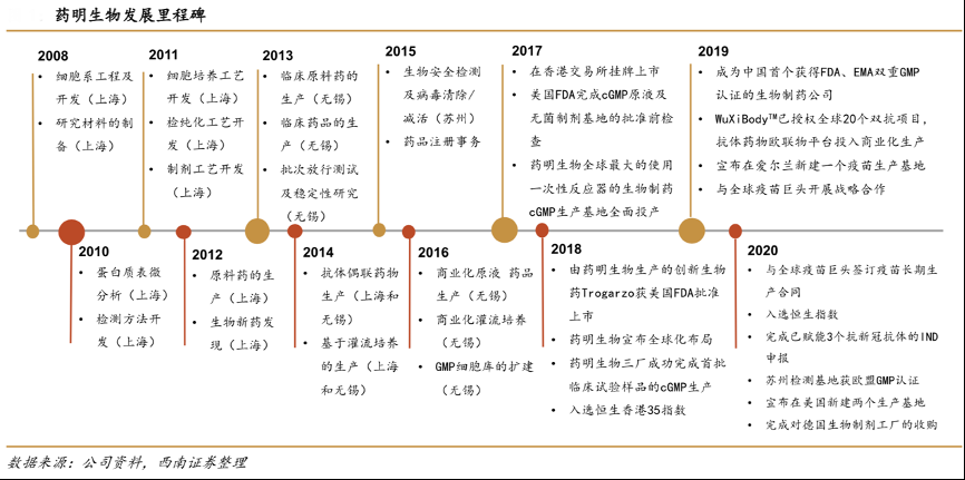經(jīng)典案例:根據(jù)公司資料、西南證券等綜合資訊表明,藥明生物公司建立于 2008 年,最初為客戶提供細(xì)胞系培育和蛋白質(zhì)分析服務(wù)。后來(lái)業(yè)務(wù)擴(kuò)大到生物新藥發(fā)現(xiàn)、生物新藥開發(fā)、生物檢測(cè)以及 GMP 生產(chǎn),成長(zhǎng)為一家真正意義上提供從概念到商業(yè)化一站式服務(wù)、開放式生物制藥技術(shù)平臺(tái)公司。