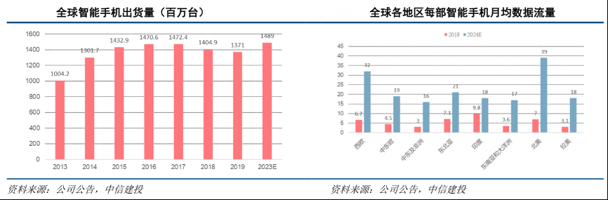 經(jīng)營(yíng)案例:根據(jù)公司公告、中信建投等綜合資訊表明,安克創(chuàng)新公司秉持“淺海戰(zhàn)略”進(jìn)行品類選擇,避開(kāi)競(jìng)爭(zhēng)激烈、技術(shù)成熟、體量較大的“深海”市場(chǎng)如 PC、平板電腦、電視、智能手機(jī)市場(chǎng),專注深耕市場(chǎng)規(guī)模適中、處于萌芽或成長(zhǎng)期、海外市場(chǎng)競(jìng)爭(zhēng)平緩的細(xì)分品類。而智能手機(jī)是典型的“深海”市場(chǎng)。據(jù) IDC 數(shù)據(jù),2019 年全球 智能手機(jī)出貨量 13.71 億部,預(yù)計(jì)到 2023 年將上升至 14.89 億部,呈現(xiàn)在高基數(shù)基礎(chǔ)上繼續(xù)穩(wěn)步發(fā)展態(tài)勢(shì)。結(jié)合愛(ài)立信統(tǒng)計(jì),全球智能手機(jī)用戶月均使用數(shù)據(jù)流量將大幅提升,預(yù)計(jì)大部分地區(qū)2018-2024年CAGR在30%以上,全球消費(fèi)者對(duì)移動(dòng)電子設(shè)備使用依賴度將持續(xù)上升。