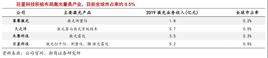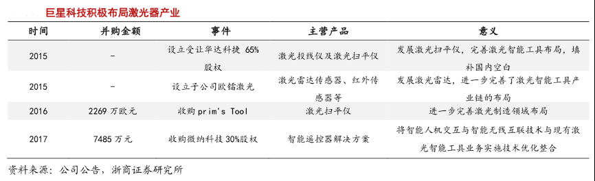 經(jīng)典案例:根據(jù)公司官網(wǎng)、浙商證券研究所等綜合資訊表明,巨星科技公司 2015 年進(jìn)入激光產(chǎn)品領(lǐng)域,先后通過收購華達(dá)科捷 65%股權(quán)、設(shè)立子公司歐鐳激光、收購 Lecia 旗下子公司 Prim’s Tool、收購微納科技 30%股權(quán),不斷完善布局激光量具、激光雷達(dá)、高精度角度及距離傳感器、激光智 能設(shè)備產(chǎn)線。目前歐鐳激光研發(fā)的激光2D/3D 雷達(dá)傳感器可應(yīng)用于機(jī)器人、安全監(jiān)視、 工業(yè)自動化和物流、智能汽車等領(lǐng)域,2019年,其激光業(yè)務(wù)全球市占率約為0.5%。