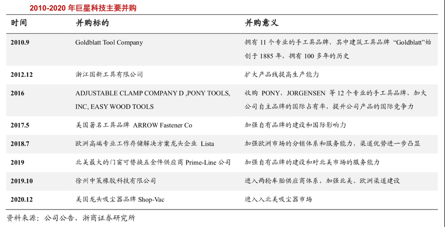 經(jīng)典案例:根據(jù)公司公告、浙商證券研究所等綜合資訊表明,巨星科技公司積極并購整合拓寬下游渠道, 2010 年至今公司先后收購五金工具相關(guān)業(yè)務公司 8 個及品牌 25 余個,產(chǎn)品線與生產(chǎn)能力大幅提升。此外并購整合同業(yè)公司使其協(xié)同效應提升,進一步提升其國際品牌力。
