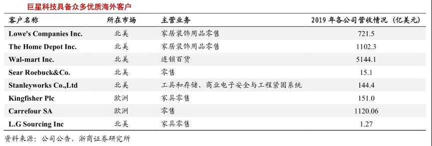 經(jīng)典案例:根據(jù)公司公告、浙商證券研究所等綜合資訊表明,穩(wěn)定銷售渠道和客戶信賴保障巨星不斷發(fā)展。全球范圍內(nèi)銷售其產(chǎn)品的五金、建材、商超約有 3 萬家,廣泛的渠道有效保證公司各類創(chuàng)新型產(chǎn)品的高速發(fā)展。巨星科技已覆蓋的主要優(yōu)質(zhì)大型商超,包括 Home Depot (家得寶)、Lowes (勞氏)、Kingfisher (翠豐) 等家具建材連鎖超市、Walmart (沃爾瑪)、Carrefour (家樂福)、Sears (西爾斯)等綜合型零 售超市、Autozone (汽車地帶)、Pep Boys、Grainger 等專業(yè)零售連鎖店。