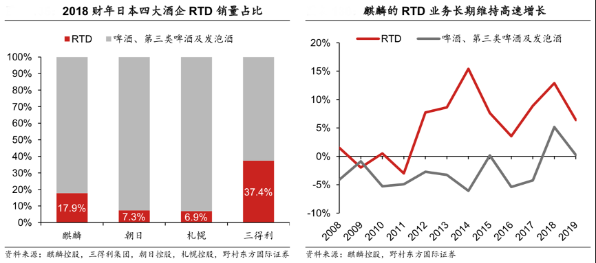 經(jīng)典案例:根據(jù)麒麟控股、三得利集團(tuán)、朝日控股、札幌控股、野村東方國(guó)際證券等綜合資訊表明,2019財(cái)年,RTD 市場(chǎng)龍頭三得利和麒麟的 RTD 銷(xiāo)量分別占與啤酒/替代型低價(jià)啤酒(發(fā)泡酒及第三類(lèi)啤酒)總銷(xiāo)量的37.4%及 17.9%,成為其業(yè)務(wù)環(huán)節(jié)中極為重要的一部分。以麒麟為例,在其啤酒/替代型低價(jià)啤酒業(yè)務(wù)銷(xiāo)量持續(xù)下滑的情形下,RTD 的銷(xiāo)量保持了較高增速。