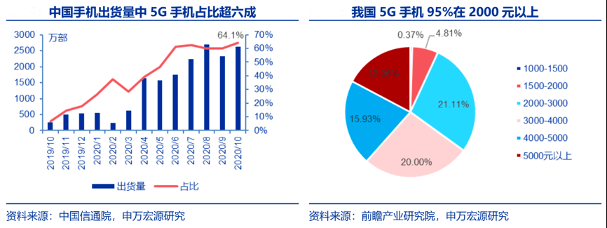 經典案例:根據(jù)中國信通院、前瞻產業(yè)研究院、申萬宏源研究等綜合資訊表明,2019年,中國 5G 手機出貨量近1,400 萬臺,在 5G 商用短短 2 個月、發(fā)牌 6 個月的時間里,已形成全球最大的 5G 手機市場。同時當前我國 5G 手機市場中,價格在 2000 元以上的占比約為 95%,以 2000-3000 元的中高端機為主。
