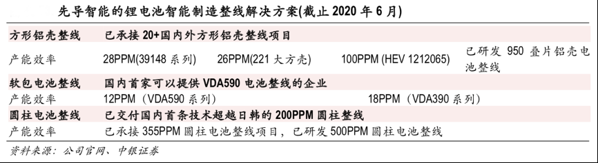 經(jīng)典案例:根據(jù)公司官網(wǎng)、中銀證券等綜合資訊表明,先導(dǎo)智能最早主營(yíng)業(yè)務(wù)為薄膜電容器設(shè)備,切入鋰電池設(shè)備行業(yè)后,憑借著部分相通的核心技術(shù),其自主研發(fā)了分切機(jī)、卷繞機(jī)、注液機(jī)等設(shè)備,隨后其通過(guò)外延并購(gòu)和自主研發(fā)兩種方式進(jìn)一步完善了在前、中、后段其他設(shè)備的布局,成功進(jìn)化為整線解決方案提供商。截止到2020 年上半年,其已承接近 20 條國(guó)內(nèi)外整線項(xiàng)目,已交付國(guó)內(nèi)首條 200PPM 圓柱整線,承接首條 355PPM 圓柱整線。