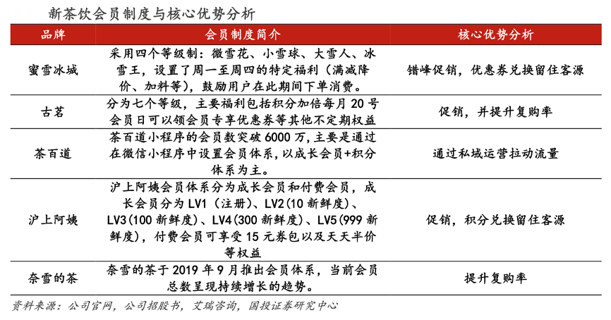 經(jīng)典案例:根據(jù)公司官網(wǎng)、公司招股書、艾瑞咨詢、國(guó)投證券研究中心等綜合資訊表明,五家茶飲企業(yè)均采用會(huì)員制的方式進(jìn)行客戶留存,以提升新客轉(zhuǎn)化率。會(huì)員制的核心目在于,通過(guò)積分的方式推進(jìn)復(fù)購(gòu)率的提升,推動(dòng)老客群體的多次消費(fèi);同時(shí)以會(huì)員制形成一個(gè)較好的渠道,從而使得新茶飲企業(yè)利用新媒體進(jìn)行更多的私域流量引流。