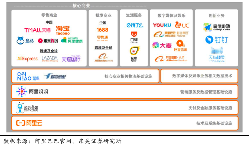 經(jīng)典案例:根據(jù)阿里巴巴官網(wǎng)、東吳證券研究所等綜合資訊表明,阿里系的強大在于其圍繞“買賣”創(chuàng)立了完善的商業(yè)交易機制,并圍繞交易提供了菜鳥物流、蜂鳥即配,負責物流快遞及即時物流等,圍繞營銷服務建立了“阿里媽媽”營銷平臺,圍繞支付建立了“支付寶”為核心的螞蟻金服,圍繞交易數(shù)據(jù)存儲及云端賦能建立了“阿里云”服務平臺。