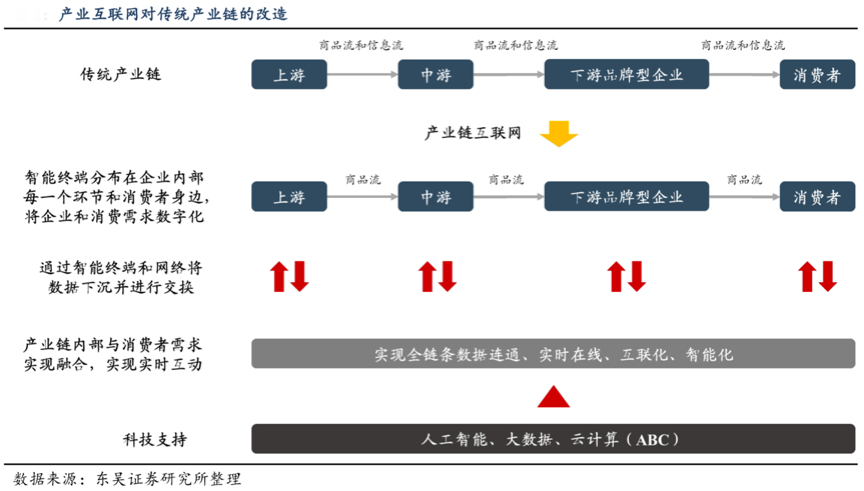 根據(jù)東吳證券研究所等綜合資訊表明,產(chǎn)業(yè)互聯(lián)網(wǎng)對傳統(tǒng)產(chǎn)業(yè)鏈的改造,在于其改變了傳統(tǒng)規(guī)模化成長的產(chǎn)業(yè)鏈條,將智能終端分布于企業(yè)經(jīng)營策劃、品牌營銷策劃運營及用戶消費等各個層面,通過數(shù)據(jù)收集、反饋、洞察、再賦能等全鏈條數(shù)據(jù)化管理,強化數(shù)字化、智能化對產(chǎn)業(yè)互聯(lián)網(wǎng)發(fā)展的巨大驅(qū)動作用,真正實現(xiàn)“科技賦能”產(chǎn)業(yè)互聯(lián)網(wǎng)。