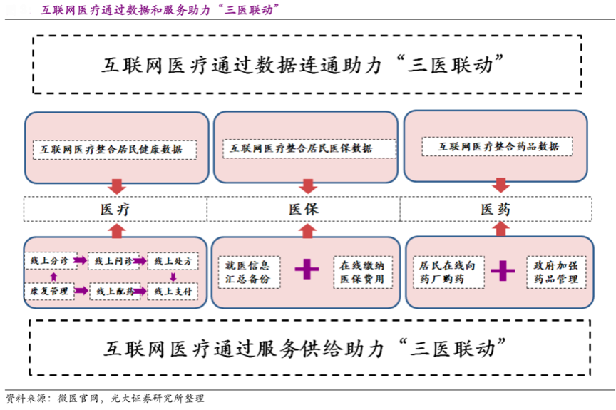 互聯(lián)網(wǎng)醫(yī)療涉及到醫(yī)療、醫(yī)保、醫(yī)藥等多個醫(yī)療環(huán)節(jié),需要以數(shù)字化技術(shù)作為重要系統(tǒng)支撐,互聯(lián)網(wǎng)醫(yī)療通過數(shù)據(jù)和服務(wù)助力“三醫(yī)聯(lián)動”,醫(yī)療數(shù)據(jù)和醫(yī)療服務(wù)成為互聯(lián)網(wǎng)醫(yī)療發(fā)展的兩大核心環(huán)節(jié)。據(jù)微醫(yī)官網(wǎng)、光大證券研究所等綜合資訊表明,互聯(lián)網(wǎng)醫(yī)療的快速發(fā)展,需要借助醫(yī)療服務(wù)強(qiáng)化醫(yī)生患者在線溝通、在線診斷建議及線上處方開具等,以服務(wù)聚合醫(yī)療消費;同時大量醫(yī)療服務(wù)需要強(qiáng)化醫(yī)保支付、信息匯總,更需要強(qiáng)化醫(yī)藥數(shù)據(jù)同步、藥品管理等,強(qiáng)大且專業(yè)的醫(yī)療數(shù)據(jù)使醫(yī)療服務(wù)更具成效、更具價值。
