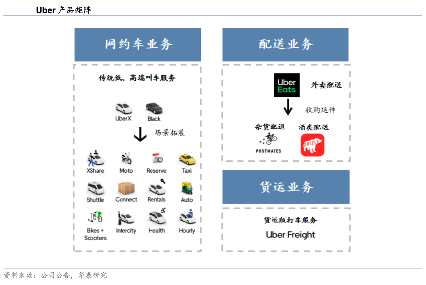 經(jīng)典案例:根據(jù)公司公告、華泰研究等綜合資訊表明,Uber出行服務(wù)起家,縱橫拓展成為全球領(lǐng)先的移動(dòng)科技平臺(tái)。