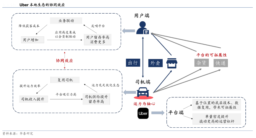 經(jīng)典案例:根據(jù)華泰研究等綜合資訊表明,相比于其競爭對手 Doordash(外賣)和 Lyft(出行)等僅從事一項業(yè)務(wù),Uber 以移動運力網(wǎng)絡(luò)的復用為基礎(chǔ),將外賣和出行業(yè)務(wù)整合,在司機端、用戶端和平臺端均帶來了更強的協(xié)同效應(yīng)。