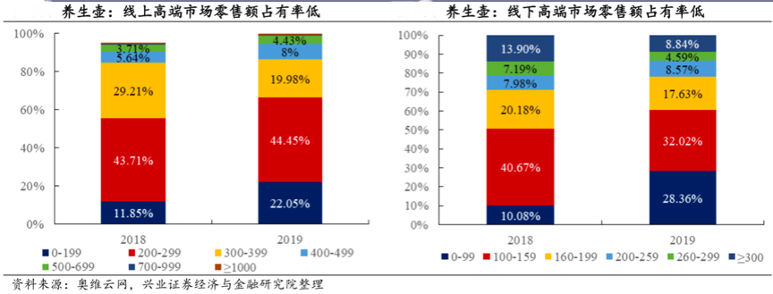 經典案例:根據奧維云網、興業(yè)證券經濟與金融研究院等綜合資訊顯示, 2019 年中國養(yǎng)生壺線上產品集中于200-299 元價格帶,線下產品多集中于 100-159 元價格帶,北鼎品牌養(yǎng)生壺均價為 600 元, 并已經成為2018年線上市場TOP 3品牌,說明北鼎的高端定位獲市場認可。