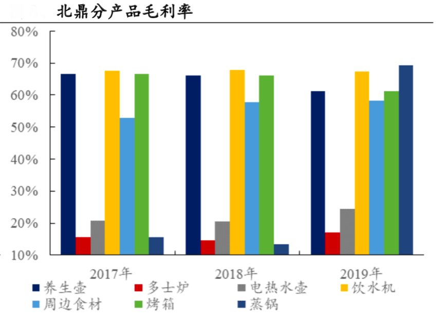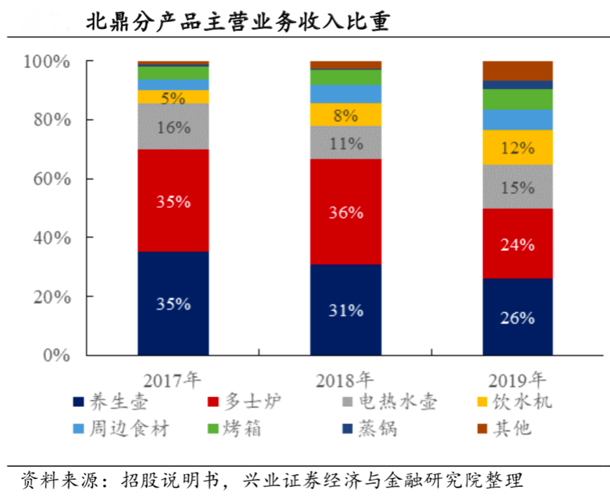 經典案例:根據北鼎股份的招股說明書、興業(yè)證券經濟與金融研究院等綜合資訊表明,從品類結構看,北鼎股份廚房小家電品類齊全,養(yǎng)生壸、多士爐仍是主流品類,飲水機、周邊食材、烤箱等產品占比日益上升,2019年其占主營業(yè)務收入占比分別為 11.9%、7.0%、6.9%,其產品結構化競爭力凸顯。