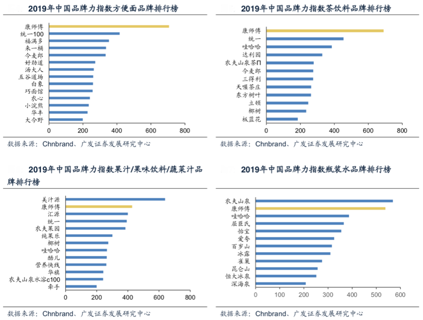 經(jīng)典案例:根據(jù)Chnbrand、廣發(fā)證券發(fā)展研究中心等綜合資訊表明,康師傅在方便面和茶飲料中均排名第1位,在果 汁/果味飲料/蔬菜汁、瓶裝水和餅干/威化中均排名第2位,其在方便面、茶飲料、果汁等品類多數(shù)位居前列,其已經(jīng)成為中國方便面和軟飲料生產(chǎn)和銷售的龍頭企業(yè)。
