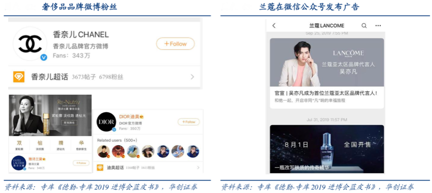 經(jīng)典案例:根據(jù)寺庫《德勤-寺庫存2019進(jìn)博會藍(lán)皮書》、華創(chuàng)證券等綜合資訊表明,大量奢侈品品牌入駐微博、微信小程序、抖音等社交軟件,粉絲眾多,香奈兒微博粉絲 343 萬、雅詩蘭黛微博粉絲 348 萬、迪奧微博粉絲 350 萬、愛馬仕微博粉絲 39 萬,數(shù)字化讓品牌 互動更頻繁,更具成效。