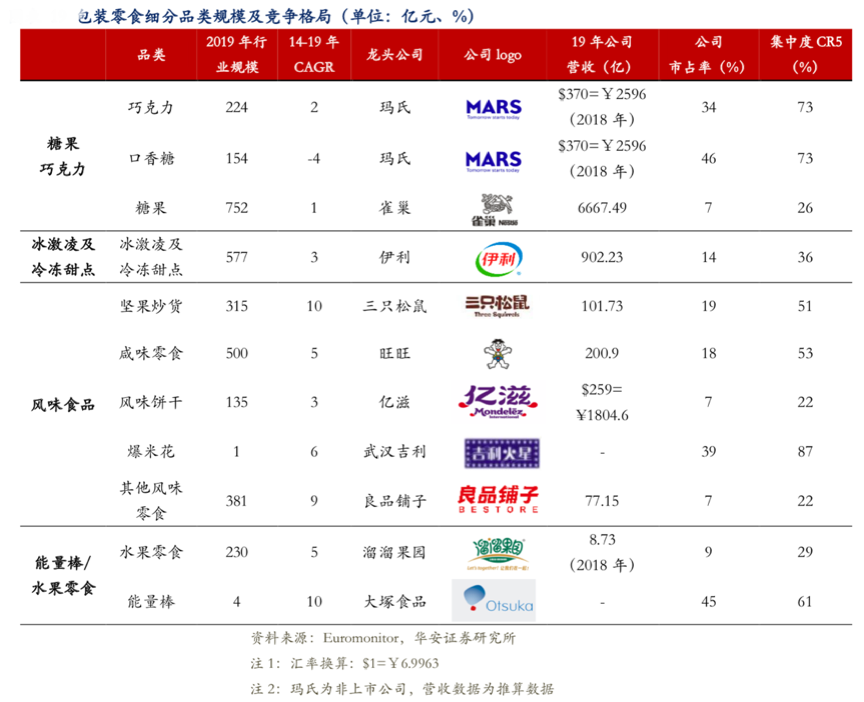 經典案例:根據Euromonitor、華安證券研究所等綜合資訊表明,包裝零食細分品類規(guī)模比較大,且每一個小品類里都已涌現出了一些細分龍頭,如巧克力龍頭瑪氏,堅果炒貨龍頭三只松鼠,但還未出現統(tǒng)領全行業(yè)的龍頭公司。2019 年我國休 閑食品行業(yè) CR5 僅為 16.3%,而全球休閑食品行業(yè) CR5 為 25.6%,我國休閑食品品類極具成長空間。