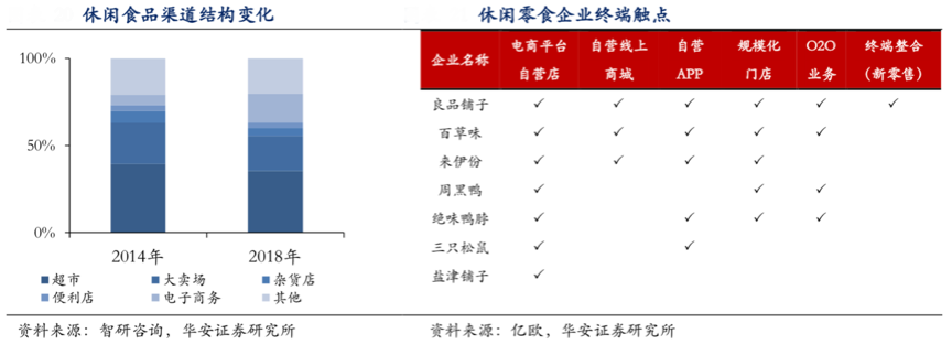 經典案例:根據智研咨詢、華安證券研究所等綜合資訊表明,2014年-2018年休閑食品渠道結構中超市占比從39%降為 35%,電子商務占比從 6%增長至 17%,消費者忠誠度較低、渠道選擇分散。同時根據億歐、華安證券研究所等綜合資訊表是,休閑零食企業(yè)的終端觸點更加多元化,良品鋪子在電商平臺、自營 線上商城、規(guī)?;T店等各方面都有布局,三只松鼠主要集中于電商平臺自營店和自營 APP。
