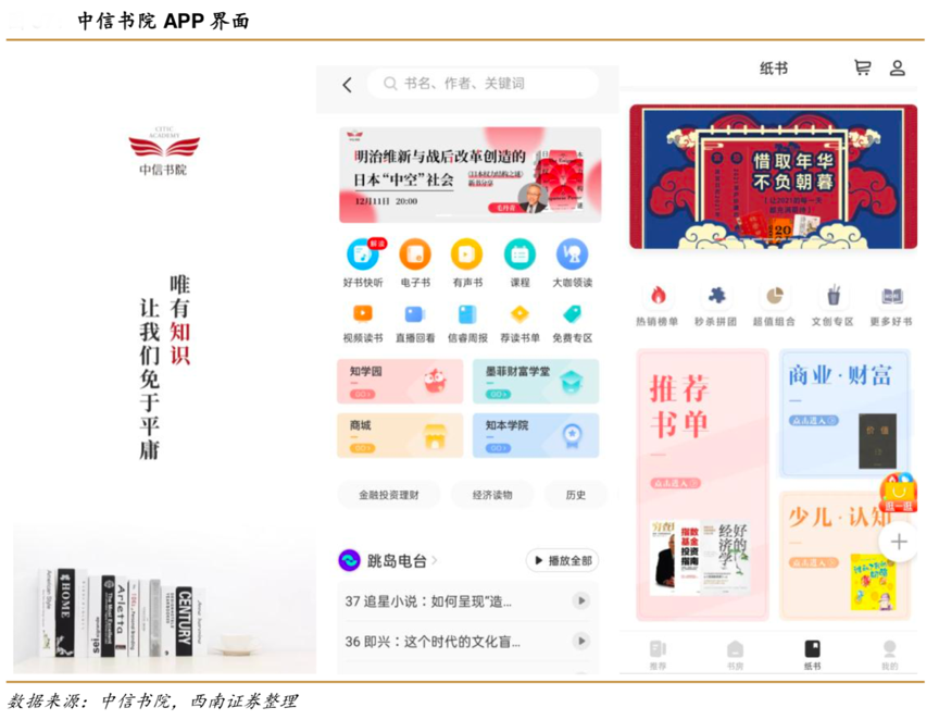 經(jīng)典案例:根據(jù)中信書院、西南證券等綜合資訊表明,2020 年上半年,在加速推動數(shù)字化升級的過程中,中信書院用戶增長近 100 萬人,中信書院拓展了中信出版提供知識的形態(tài)與方式,針對不同場景與人群,提供個性化的知識服務,包括文字、音頻和視頻,內(nèi)容上也依托中信出版自身的版權資源提供不同領域的服務,分領域?qū)κ鼙娺M行書籍推薦。