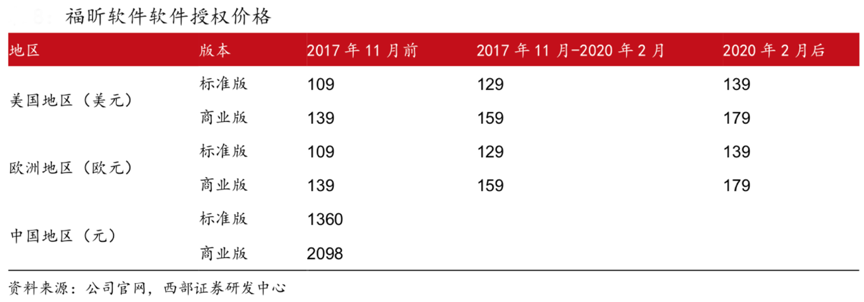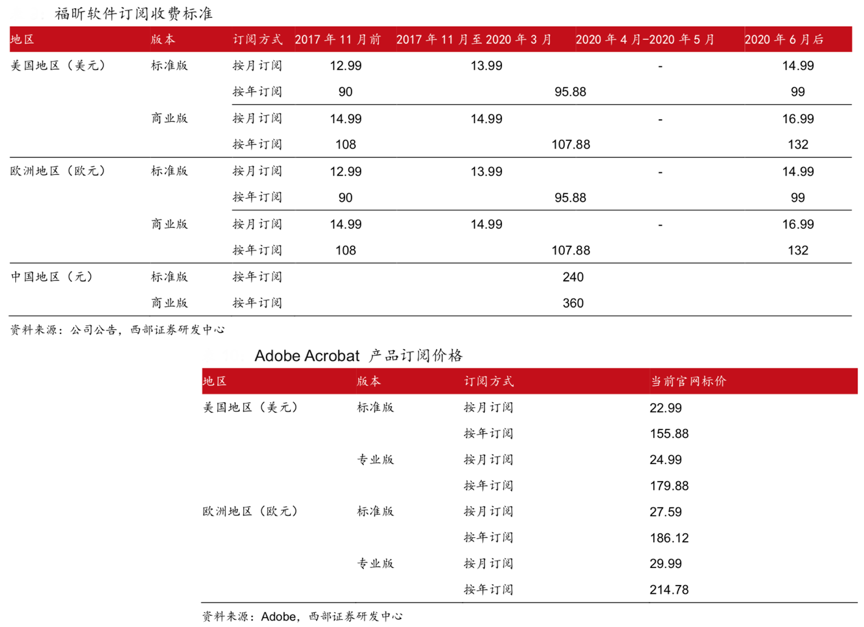 經(jīng)典案例:根據(jù)公司官網(wǎng)、Adobe、西部證券研究中心等綜合資訊表明,福昕軟件公司 Phantom PDF 10 訂閱服務(wù)按年訂閱模式下,海外主要市場全年費用標價約 132 美元或歐元,相比 Adobe 同類型產(chǎn)品 Acrobat DC 的定價低約 26-46%,在功能性能基本 相當?shù)那疤嵯拢洚a(chǎn)品服務(wù)具有更高的性價比。