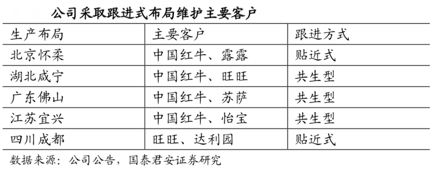 經(jīng)典案例:根據(jù)國(guó)家統(tǒng)計(jì)局、公司官網(wǎng)、國(guó)泰君安證券研究等綜合資訊表明,奧瑞金公司為中國(guó)紅牛、東鵬特飲、戰(zhàn)馬 和國(guó)內(nèi)外若干知名品牌產(chǎn)品提供穩(wěn)定高質(zhì)的包裝一體化服務(wù)。在二片罐 業(yè)務(wù)方面,其與青島、百威、雪花、燕京等客戶建立重要業(yè)務(wù)合作關(guān)系,在奶粉領(lǐng)域,其充分發(fā)揮廠中廠模式的優(yōu)勢(shì),成為飛鶴、君樂(lè)寶、伊利等奶粉企業(yè)的主要包裝供應(yīng)商。