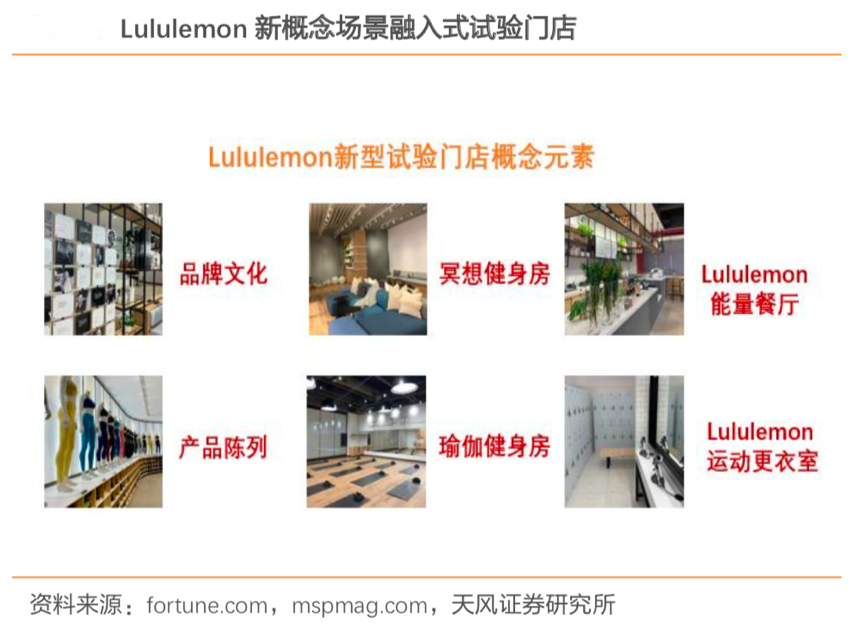 經(jīng)典案例:根據(jù)fortune.com、mspmag.com、天風證券研究所等綜合資訊表明, Lululemon提出“新概念場景融入式門店”,旨在為客群提供一體化場景式購物體驗,探索關(guān)聯(lián)行業(yè)協(xié)同運營可行性:試驗門店中開辟“店中店”形式健身房,提供瑜伽、冥想低熱及綜訓等高熱活動課程服務,并提供咖啡餐飲服務,同時配合推廣 mirror 智能健身產(chǎn)品服務。