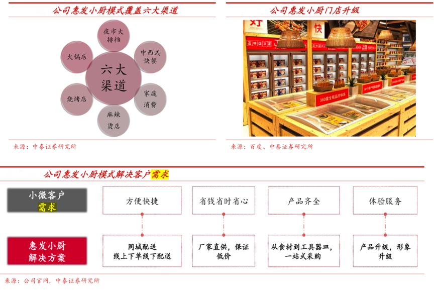經(jīng)典案例:根據(jù)公司官網(wǎng)、中泰證券研究所等綜合資訊表明,“惠發(fā)小廚”是惠發(fā)食品公司 2018 年開(kāi)始嘗試的一種業(yè)務(wù)模式,通過(guò)開(kāi)設(shè)食材(火鍋燒烤麻辣燙 等)一站式采購(gòu)連鎖超市,包含 600 多種食材,每一種均由廠家直供,解決火鍋料產(chǎn)品采購(gòu)品類(lèi)眾多、費(fèi)時(shí)費(fèi)力的現(xiàn)狀,滿(mǎn)足消費(fèi)者一站式低價(jià)購(gòu)齊需求,其本質(zhì)上是一種一站式食材服務(wù)體系?;莅l(fā)小廚覆蓋六大渠道,引爆火鍋店、燒烤店、麻辣燙店、中西式快餐、夜市大排檔以及家庭消費(fèi)等。