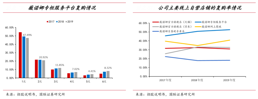 經(jīng)典案例:根據(jù)招股說明書、國聯(lián)證券研究所等綜合資訊表明,薇諾娜專柜服務(wù)平臺(tái)客戶的購買頻次在 2 次及以上的客戶數(shù)量占比較高,2017- 2019 年逐年提升,分別為 45.61%、50.70%、52.51%。其客單價(jià)較高,主要集中于 1,001-20,000 元區(qū)間內(nèi),而其線上自營店鋪用戶在快速增長的同時(shí),復(fù)購率保持 30%左右。
