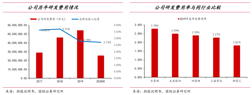 經(jīng)典案例:根據(jù)招股說明書、國聯(lián)證券研究所等綜合資訊表明,截至 2020 年上半年,貝泰妮擁有境內(nèi)有效專利46 項(xiàng), 并掌握 11 項(xiàng)核心技術(shù),在利用馬齒莧、青刺果、滇山茶等高原特色植物進(jìn)行植物提取物的有效成分制備,以及生產(chǎn)含有高原特色植物活性成分的敏感肌膚護(hù)理產(chǎn)品方面具有較強(qiáng)的技術(shù)優(yōu)勢。2017-2019 年其研發(fā)費(fèi)用的年復(fù)合增速為 37%,2019 年研發(fā)費(fèi)用率為 2.78%, 高于同行業(yè)其他可比上市公司。