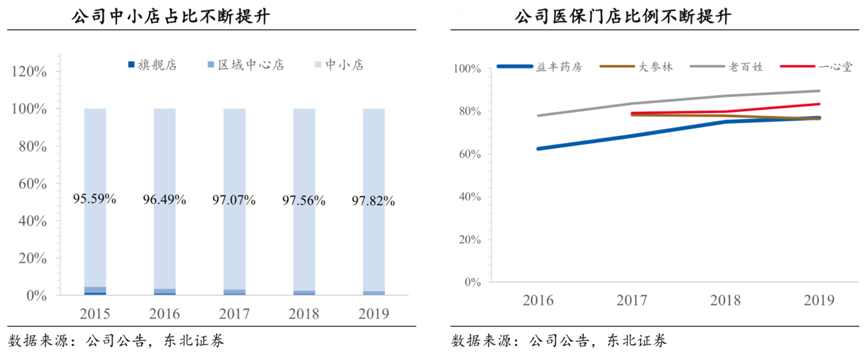 經(jīng)典案例:根據(jù)公司公告、東北證券等綜合資訊表明,隨著益豐藥房在各區(qū)域市場(chǎng)的深耕,深入社區(qū)的中小店的比例逐年提高。其對(duì)醫(yī)保門(mén)店的比例也愈發(fā)重視,2016年醫(yī)保比例僅 62.3%,提升至 2019 的 76.82%,與行業(yè)水平的差距逐年縮小。尤其在華東地區(qū) 2016-2019 年醫(yī)保覆蓋率從 36.91%增長(zhǎng)至 72.52%,使得其競(jìng)爭(zhēng)力繼續(xù)增強(qiáng)。